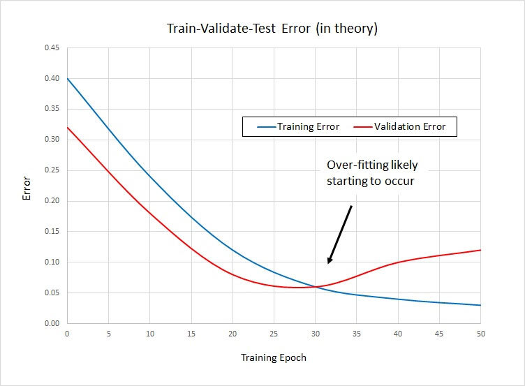 이러한 과적합 문제를 방지하기 위해 사용할 수 있는 방법 중 하나는 '검증 데이터셋(validation dataset)'을 사용하는 것이다. 원래 전체 데이터 100 중에서 80을 training set, 나머지 20을 test set으로 썼다고 한다면, 이제는 training set 80 중에서 일부를 검증 데이터셋으로 사용해, 특정 학습 횟수(training epoch)가 끝날 때마다 해당 모델의 성능을 validation set을 통해 검증하고, 에러를 구한다. 아래 그래프를 보면 파란색 그래프(training error, 학습데이터에 대한 오류)는 학습 횟수가 증가할 수록 계속 감소하는 것을 볼 수 있는데, 이는 모델이 training dataset에 점점 더 fit 되어가는 과정이다. 반면, epoch이 30을 넘는 순간 빨간색 그래프(validation error)는 상승하게 된다. 즉, 모델이 training data에 대해서는 잘 예측하지만, 새로운 데이터(validation data)에 대해서는 예측을 잘 하지 못해 해당 지점부터 validation error가 증가한다는 것을 알 수 있다. 모델이 overfit 되기 시작하는 순간이다. 따라서 training epoch이 30일 때 모델의 학습을 멈추는 것이 가장 이상적인 성능을 이끌어낸다고 할 수 있다.
