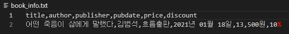 f.write(','.join([title, author, publisher, pubdate, price, discount]))